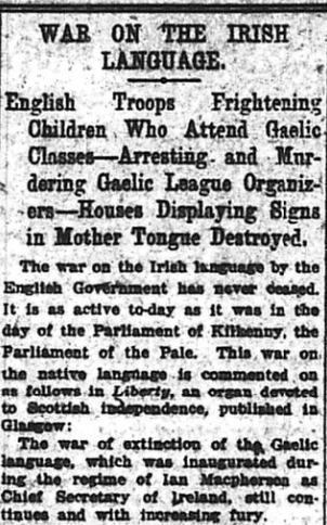 The number of Irish language schools in the North of Ireland is growing and many in Ireland are proud to speak their native language. Unfortunately, one hundred years after the article in The Gaelic American, there is still a war on the Irish language and ignorance from the British Government towards the Irish language is still prevalent.