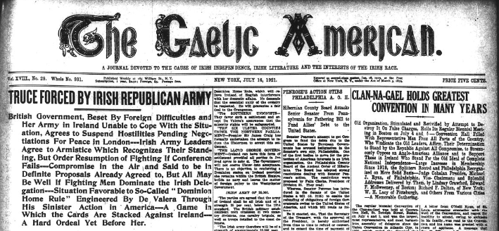 After two and a half years of guerrilla warfare, on July 11, 1921, a truce was declared between the Irish Republican Army and the combined military/police force of the British government. The Gaelic American reporting of the truce was ecstatic, but the animosity Editor John Devoy had towards Eamon De Valera was palatable immediately from the headline, “Situation Favorable to So-Called ‘Dominion Home Rule’ Engineered By De Valera Through His Sinister Action In America – A Game In Which The Cards Are Stacked Against Ireland – A Hard Ordeal Yet Before Her.” This divisive characterization was to be a foreshadowing of the split in the republican movement prompted by the Anglo-Irish Treaty in December 1921, which began the Irish Civil War.