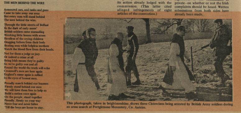 Paddy McGuigan of The Barleycorn wrote a song called “Men Behind the Wire” which described the events of that period – in the 1972 live version of the tract, he described the scene: “On Monday, the ninth of August, 1971, at 4am, Irishmen from all over the Six Counties were taken from their homes. Hundreds of these men are now imprisoned without trial in Long Kesh concentration camp. This is a song, born of the civil resistance campaign which followed internment, a song for the men in Long Kesh, the men behind the wire.”