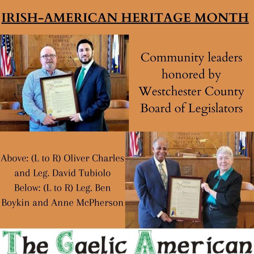 White Plains, NY — The Westchester County Board of Legislators kicked off Irish-American Heritage Month with a virtual ceremony on March 7th that highlighted the life experiences of two Irish-Americans – Anne McPherson, former White Plains City Clerk, and Oliver Charles, proprietor of Yonkers’ “The Butcher’s Fancy” – and paid tribute to their civic accomplishments.