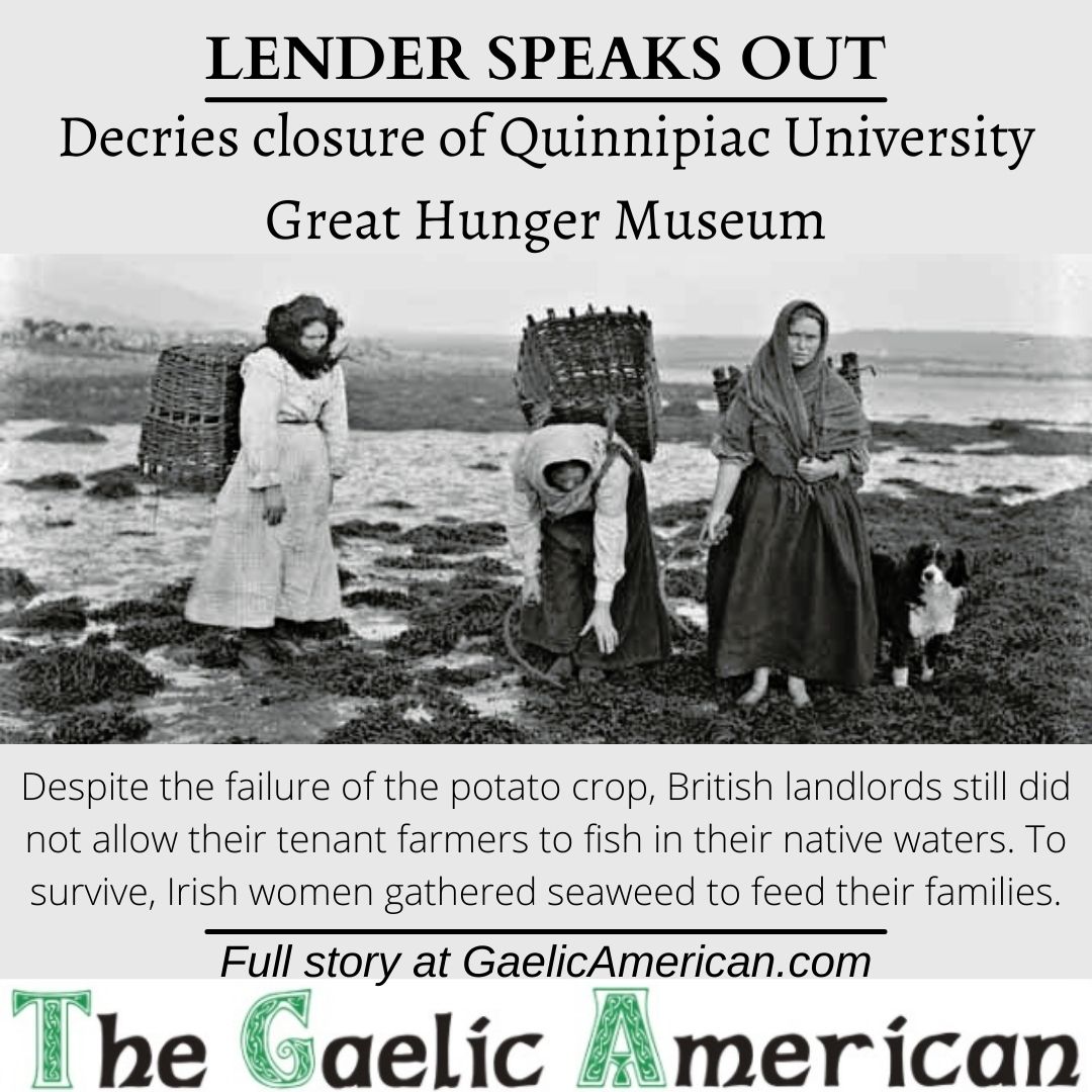 Lender said, in part, “I learned with profound sadness and disappointment that Quinnipiac University has decided to permanently close Ireland’s Great Hunger Museum, a museum that was very near and dear to our family’s heart. Its very existence is rooted in the philanthropy of our family and, more specifically, my brother Murray and me…